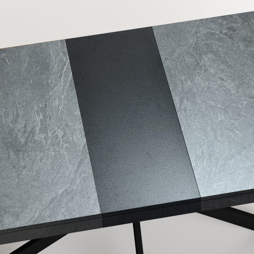 Rectangular Stretch Dining Table - Dark Grey Stone Top and Black Relief Plate - Black Fine Sand Cross Iron Foot Base with Storage Box